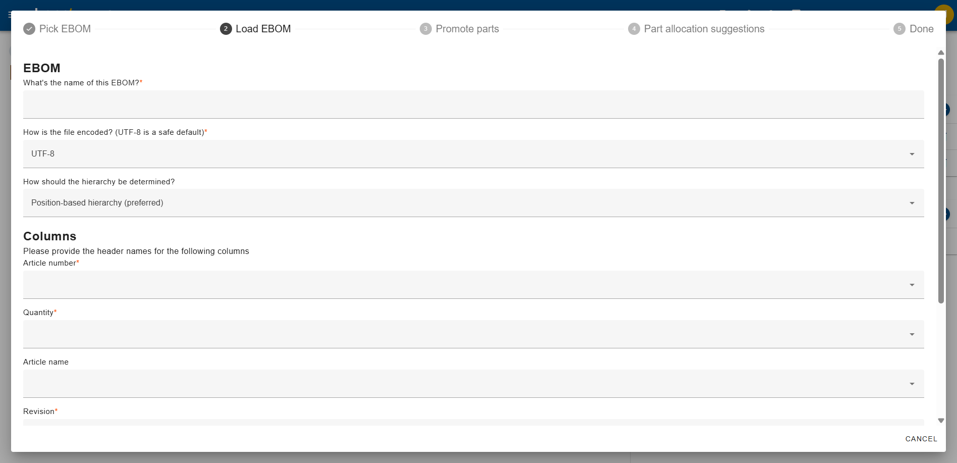 Let's start by uploading an EBOM into an empty BOP. Unfold the right-hand side pane and click on Load EBOM and select your method of choice.