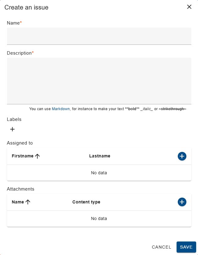 Notice that you can add a Label to your issue. Use this to define the issue type (e.g. engineering chage proposal, process improvement or product issue). Your administrator can add, modify and delete these issue labels.